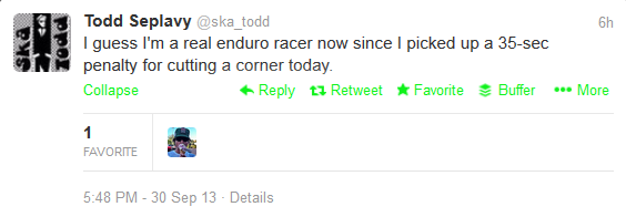 “Today during Special Stage1 at Mavic® Trans-Provence 2013, six riders were each given a 35 second penalty for cutting corners. The incidents were seen by myself personally. They were not reported by another competitor or any second party.
