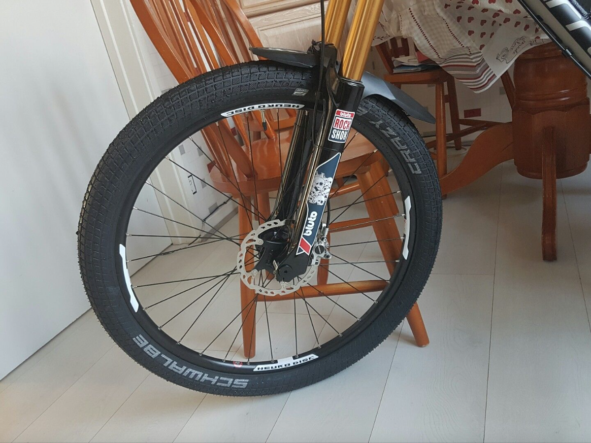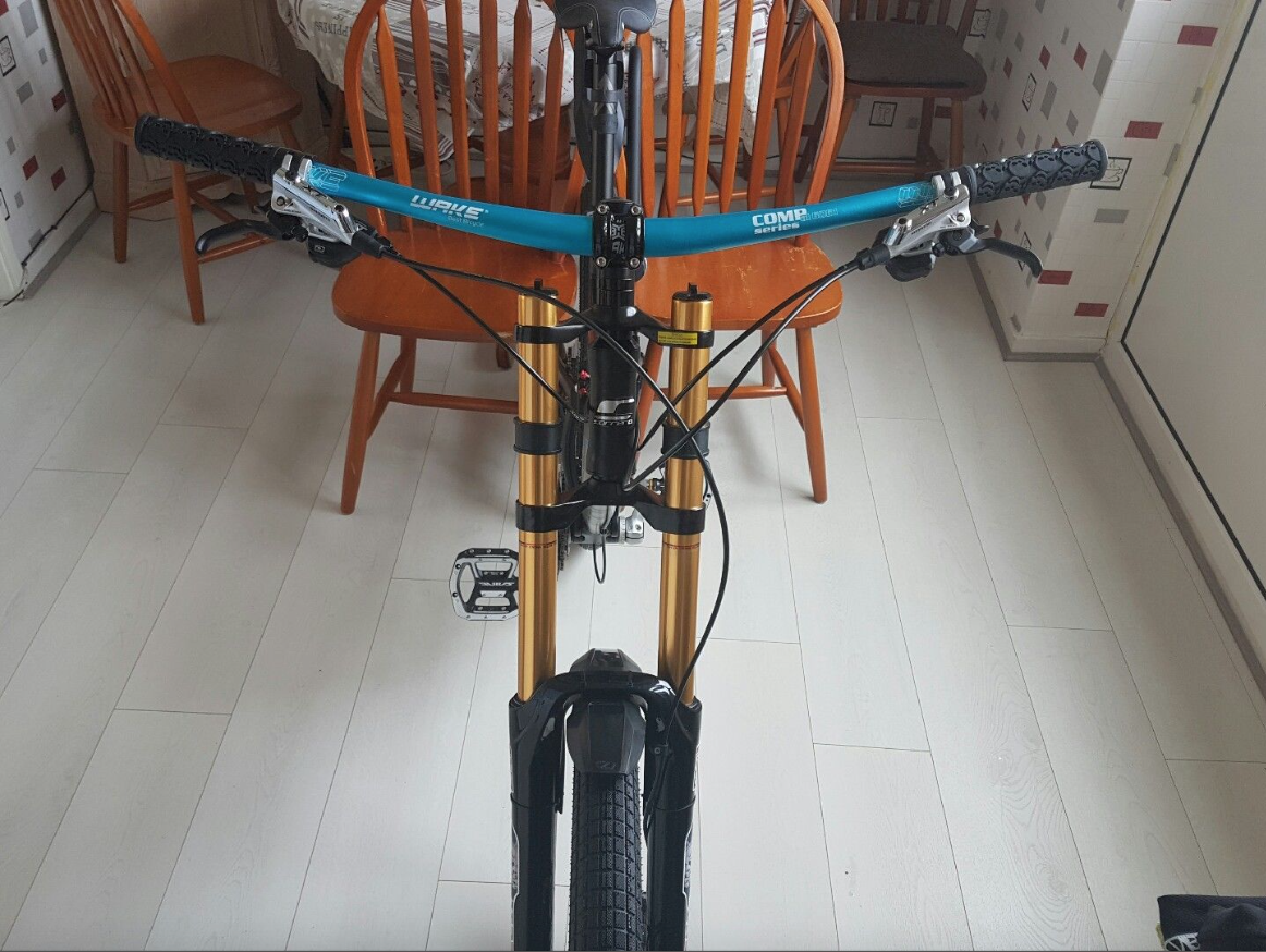 Let’s take a closer look: fork decals from a RockShox Bluto (designed for fat bikes), ‘Kashima’ stanchions (that we’d put money on being fakes), a ridiculous stem stack, a mud guard that’s closer to the ceiling than the wheel and tyres that would look more at home on a dirt jump bike. This is a true frankenbike.