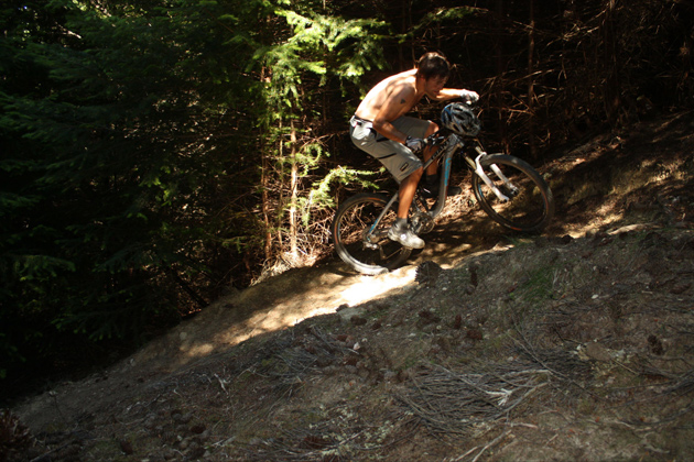 The “Das Uber D” consists of a staggered descent of the Skyline hill, with climbs linking sections of DH together to create one very intense little event. This year the course took a different route, featuring one big gut buster climb from Huck Up onto the fireroad and all the way back up to midway clearing, some half a kilometre ascent I’m guessing. By the time you hit this climb you were feeling pretty sore, and by the time I got to the midway clearing I had a stitch so bad that I was moaning like a little girl, to the point where Lynne and Emily Weir thought I’d stacked and injured myself. Not this week anyway…