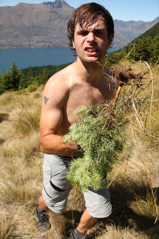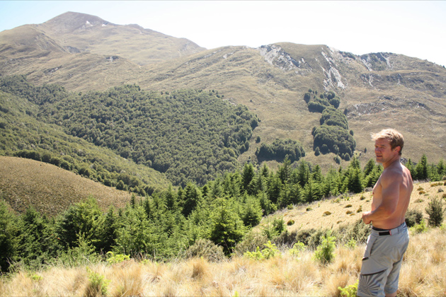 Neil looks out to the native beech forest in the background, as the wilding firs creep up into the foreground.