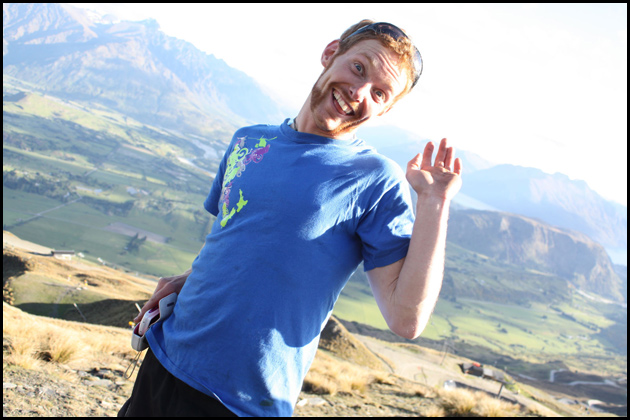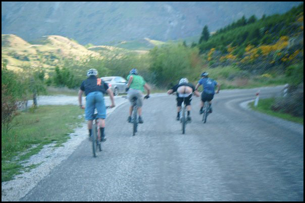 One of the most recent rides we embarked on saw a gang of us headed up Coronet Peak to ride the old XC downhill. Amazingly, despite not having any maintenance for almost two years, it’s in great condition. I’m not sure it’s the snow in the winter or just the fact it doesn’t get ridden so much since NZ Ski close the lifts to bikers. It’s a slog of a climb up, but the view from the top is just breath taking. It was biking in it’s purest form. Good friends, good trails, great views and lots of laughing. The laughter was mainly directed at Simon Smith’s pink camera and it’s white leather case with hip attachment. See for yourself… At least he’s comfortable with his sexuality. Fnar fnar. The evening was rounded off with a flat out and very sketchy run of Zoot track and then an arse bearing aero race down the coronet peak road.