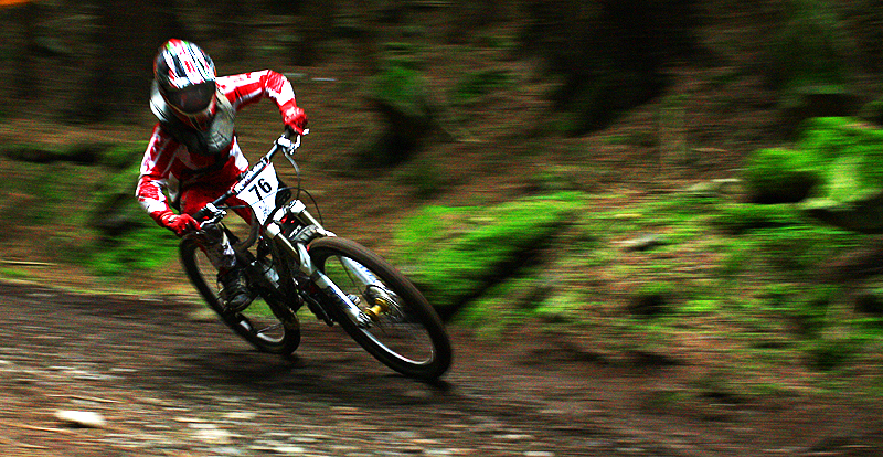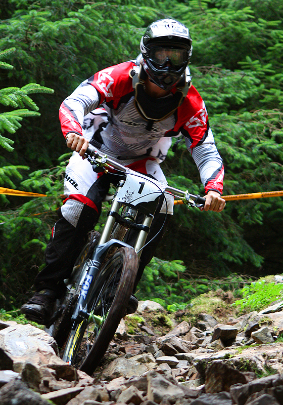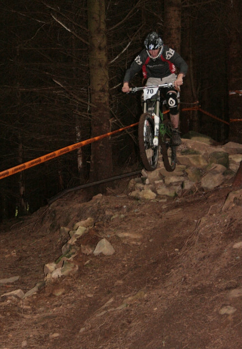 The track itself is technically challenging for the top 2 thirds with plenty of line choice and natural features including the sections “Wet rocks”, “Car Crash Corners” and the infamous “Snooker Balls”. Once you get down to the stream crossing and over the bridge you hit a super fast disused fire road. The fire road is steep enough to carry loads of speed into the drifty turns followed by the sectioned know as “The Trail Centre”. Don’t let the name of this put you off as it is super fast and contains features that wouldn’t be allowed on the average red route! Getting close to the end of the track now there a 2 options of step down followed by a table top with different shape transitions across its take off. Hit the middle for maximum air and style points or the edge for low, fast racer style. Finally there is a fast grassy straight before dropping in and over the 2 wall drop/jumps and into the finish area. Here’s a vid from the race weekend…