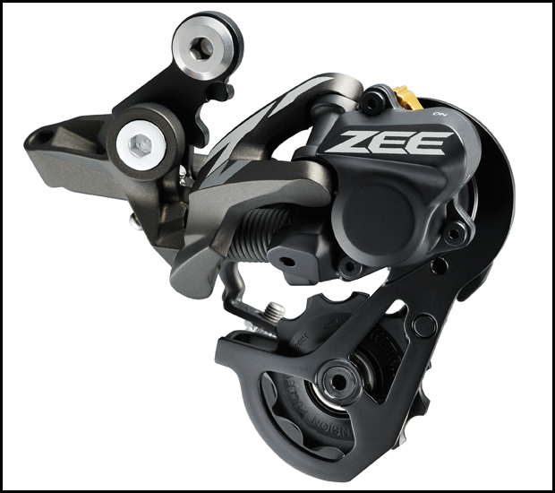 Anyway, we’ll start with what we’re guessing is easily going to be the biggest seller; the rear mech. At £69.99 it’s half the price of a Saint equivalent, and yet on paper it doesn’t seem a whole lot different. Most importantly the Shadow+ chain stabilisation system is present, and although this mech lacks the little rubber bump stop on the B bracket we still reckon it should be super quiet. The only significant feature difference is that rather than having the mode converter which allows you to switch between close and wide ratio cassette compatibility this mech will be available in two separate versions. We don’t really think that’s much of an issue though cos most people stick with one type of cassette or the other. Like Saint the whole Zee groupset is 10 speed and designed for single ring use, and if you’re after the cheapest short cage mountain bike rear mech that Shimano do then this is it.