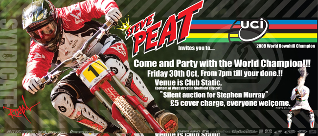 The 2009 Downhill World Champion, Steve Peat, is inviting you all to his house a club in Sheffield for a party. The flyer says 7pm till your done, which for a few people won’t be till the following Tuesday.