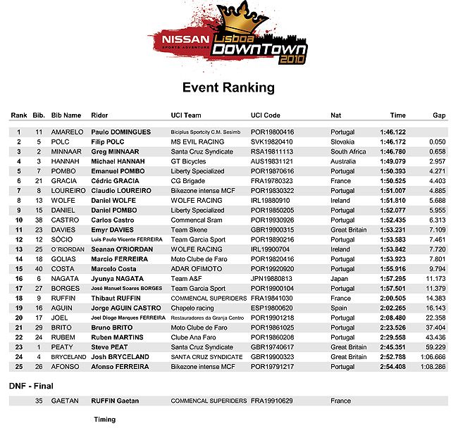 A sketchy text from my friend Alfonso in Portugal says that the 2010 Lisboa Downtown was a bit of a wash out this year with heavy rain and was nearly cancelled.