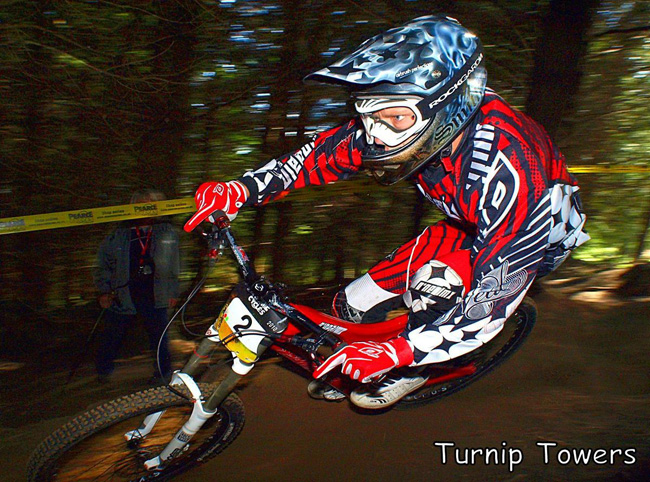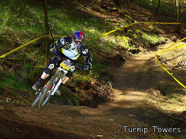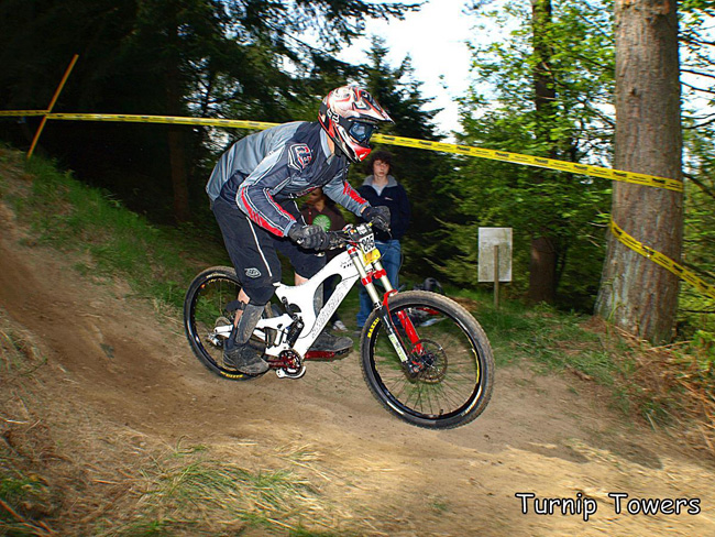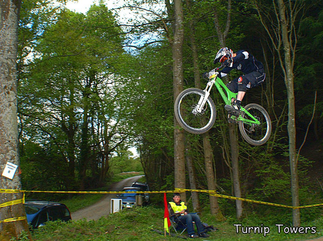 The Pearce crew had been hard at work making good use of the hill by combining old sections with new creating a speedy track with good flow. The track started with a choice of 3-4 lines right out of the beams, the choice line was out high to cut across the switchbacks but whether this was fastest or not was debatable, it was pants and trousers either way. Taking a wee switchyswoo through the trees you hit the first obstacle – a road gap of about a Nissan Micra, give or take a bumper. The tricky corner leading up to it and the lack of a lip on the take off meant most sucked up the gap, but those who had it in the bag most definitely had the advantage.
