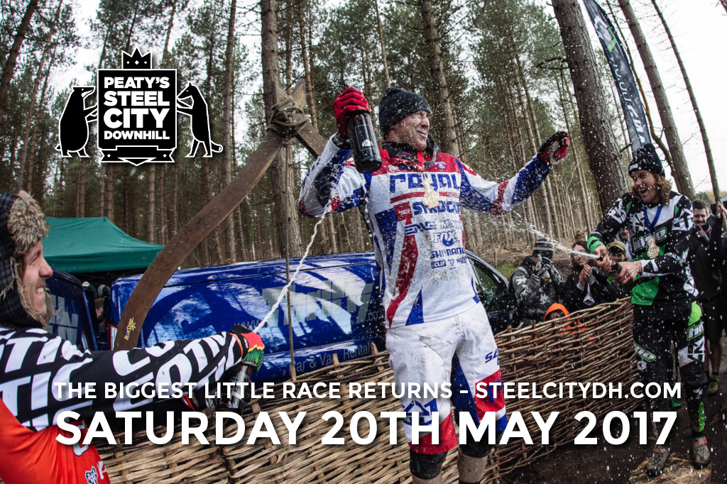 It is with great pleasure that Steve Peat and his mates can announce the details of this year’s highly anticipated Steel City DH. The biggest little race will return to Sheffield’s Greno woods for the 7th time on the 20th May. With Peaty retired from World Cup racing he’s got more plenty time to make sure that this year’s race is better than ever.