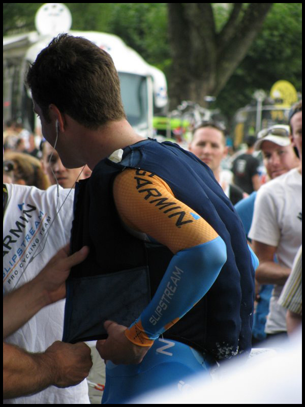 This photo from last year’s Tour de France time trial shows the efforts professional road cyclists go to warm up and keep the core cool at the same time – ice vests to keep core temp down whilst allowing the warm up to give the other beneficial effects. And a warm up might almost be more relevant for downhill if you consider the popular training mantra regarding warm ups: ‘the shorter the event, the longer the warm up’.