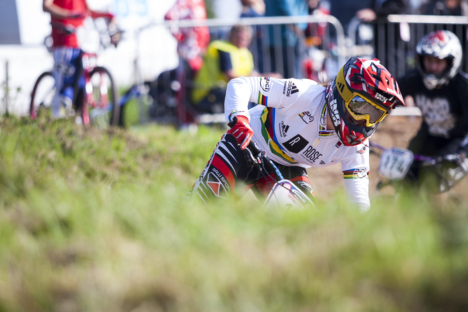 All riders competed in 3 motos to qualify them through to the knockout stages. There was action in every race and with big crowds cheering them all on, the atmosphere all day was great. In the women’s racing, it was great to see Katy Curd racing 4X again in her rainbow jersey after being crowned the 4X World Champion back in June. It was also great to see 19 riders entered in women’s – the highest rider category on the day. The women’s racing was also close and unpredictable. Lots of passing was making predicting the result tough. In the men’s it looked like being a Beaumont versus Ferris battle. Coming into the weekend Duncan Ferris was leading the overall points, however after only competing in 4 races so far in 2014, Scott Beaumont was in a great position to add his Leamington result to his points total and take the Series Championship. Through the motos it was Beaumont, Ferris and Alex Metcalfe who were winning races and looking like the favourites heading into the finals.