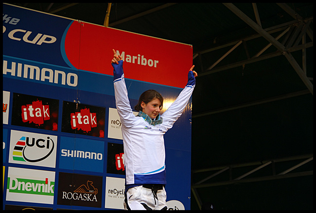 Rachel Atherton beats Sabrina Jonnier by ten seconds in the mud at Maribor.