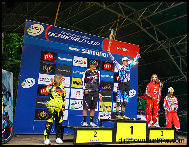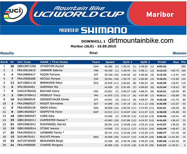 This was a major win for Atherton, after a long time waiting to get back to her winning ways. Sabrina looked strong in second but was unreservedly thumped by the young Commencal rider. Fastest qualifier and flat pedal rider Myriam Nicole bashed off her rear mech in or around the rock garden kept her podium position but Tracey Moseley only made it home with a spot of bus money, infact I don’t think you do get any money for 8th. Pugin was almost last through the speed trap ruining chances of a silver and settling for bronze. Pertra Bernhard filled out the remaining podium spot in 5th.