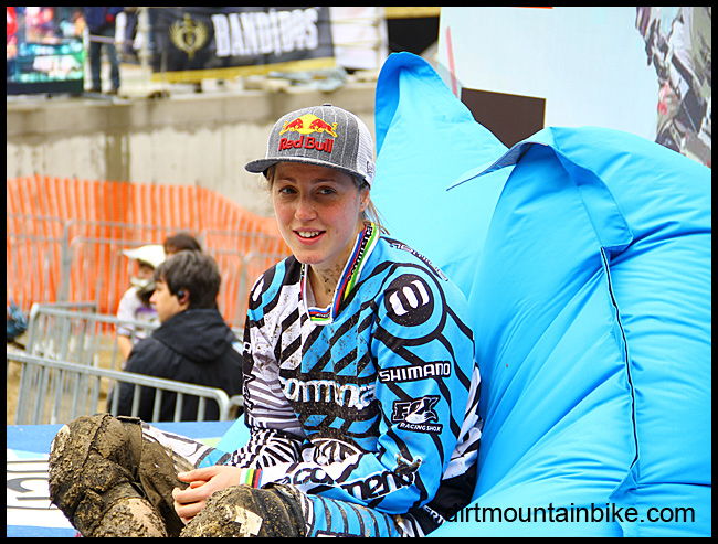 Rachel Atherton almost failed to qualify for this race. A massive slam over the finish line double in qualifying further damaging her already fragile right hand (broken finger in a training accident) almost put a stop to the weekends proceedings. However, come final day Rachel put in a “Chausson style” winning margin of ten seconds over a visibly upset Sabrina Jonnier.