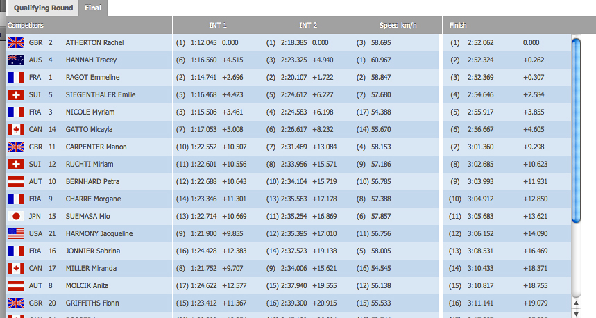 Rachel cut that one fine! After being nearly five secs up at split 2 she came up short on the big hip, got an almighty swap on and shot off the course through the tapes and re joined the track. The UCI Commissaires ruled that no advantage was gained so the result stood. Good call!