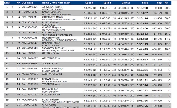 Rachel Atherton wins qualifying, by a massive 6 second gap between her and Ragot.