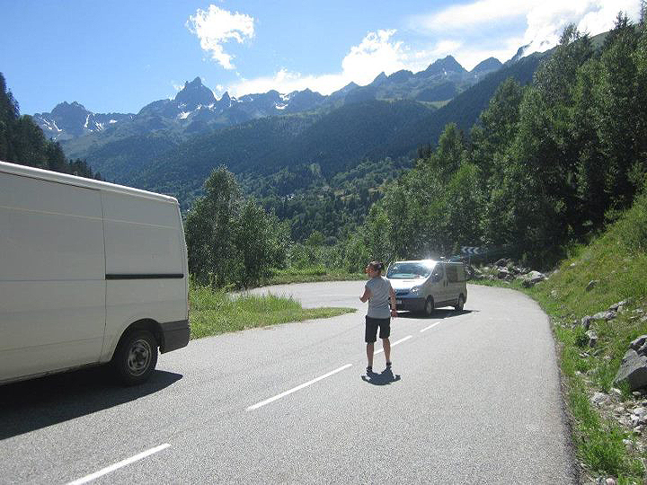 We drove up a mountain pass which the Tour had been up a couple of days before, next year I’m taking my road bike so I can ride the 25km climb! We had a few stops on the way up to check out the view and let Steve’s van cool down, the trusty VW was over heating a little…Somehow my van decided to roll back on its own accord …….see pic below……