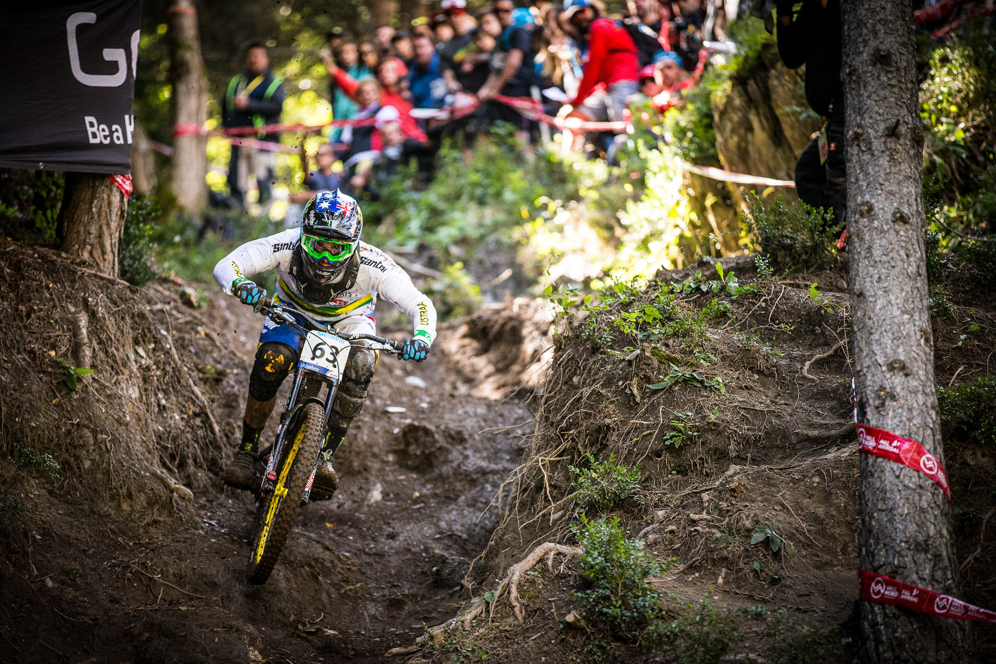 The World Champs are being held at Val di Sole, where Hill produced one of the greatest runs of all time at the 2008 edition, but crashed on the final corner to hand the win to Gee Atherton and roll over the line in third.