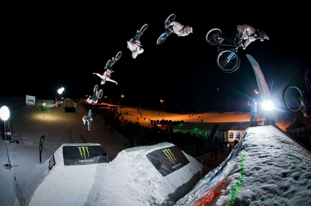 The winner Sam Reynolds topped off his near perfect first run with a true Monster Energy White Style masterpiece: he started out with a three table at the step down out of the igloo at the start, then a backflip nohand, followed by a tailwhip at the next step down, then he flipped onto the massive “Monster Ship” and flipped off the 7 meter drop. Then the unexpected went down: Sam nailed a perfect double backflip which was the first double backflip landed ever at the White Style contest!