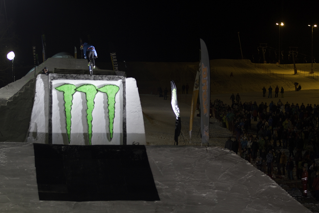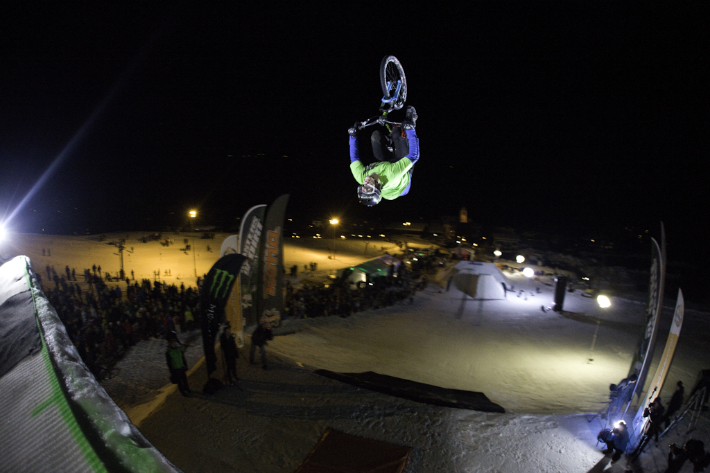 In the afternoon, the invited riders had already shown what the finals would have in store on the course built by Kona rider Grant“Chopper” Fielder by the Schanteilift in Leogang. In perfect snow conditions, Chopper definitely didn’t scrimp on airtime: Over two tons of snow – his building material of choice – left enough room for an extra massive step down the overall 18 riders used for some gigantic tricks. For example, during qualifying, winner of the last two years Sam Pilgrim from Great Britain made it abundantly clear that he is on top of his game and was ready to complete his White Style hat-trick. Unfortunately he crashed at the first obstacle in his second final run, and was out of the fight the podium places.