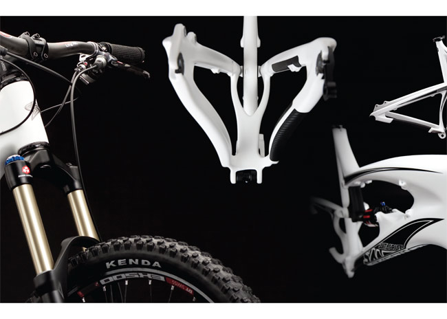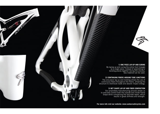 Alongside the carbon fiber makeover, the VPP suspension, and the trickest pivot hardware in the world, we added an impact absorbent protection strip underneath the downtube and along the drive side chainstay and seatstay. There’s a metal plate where the chainsuck gremlins usually strike. You’ll find cable stops for dropper seatposts integrated into the frame. An ISCG05 chainguide mount is molded into the bottom bracket area during lay-up, as are the disc brake tabs and dropouts. There’s a 1.5″ headtube up front, since we figured this bike would probably be getting treated with a bit more abuse than most taper-steerer forks would be intended to see. You can have it any color you want, so long as you like white with black decals or a matte carbon color with gold pinstripey decals.