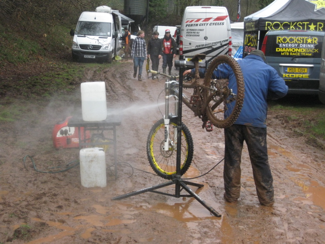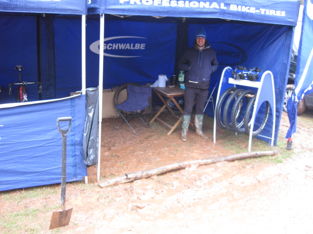 Ben from Schwable was possibly in the worst pitch spot, and was busy trying to dig out a drainage channel, going by the muddy ladies and blokes with buckets washing down bikes, I suspected the weather hadn’t been too chipper down here.