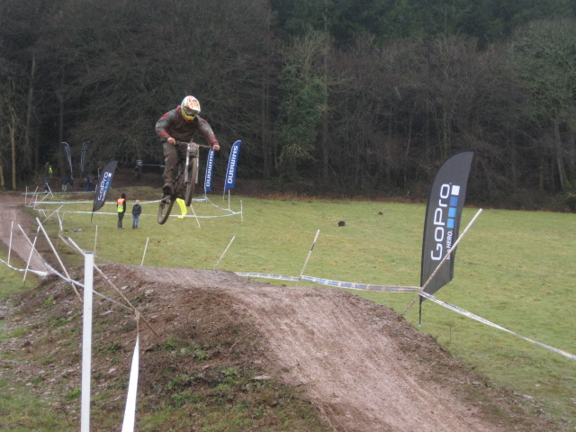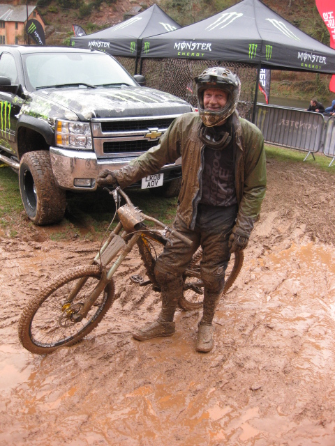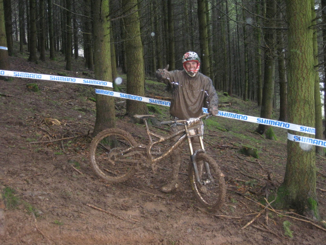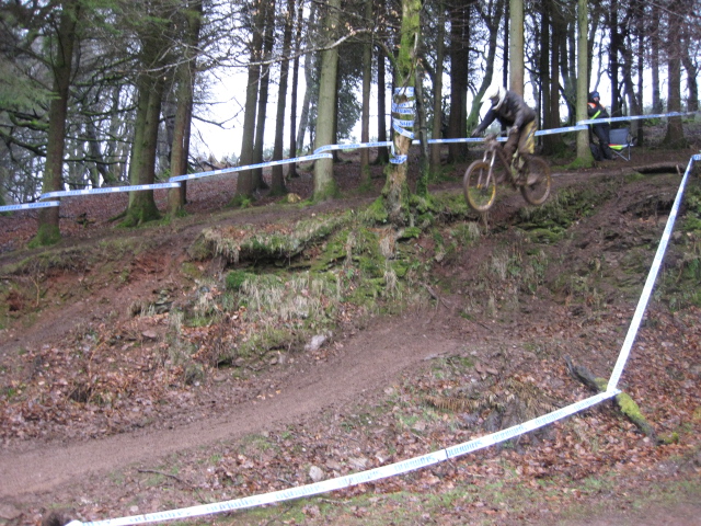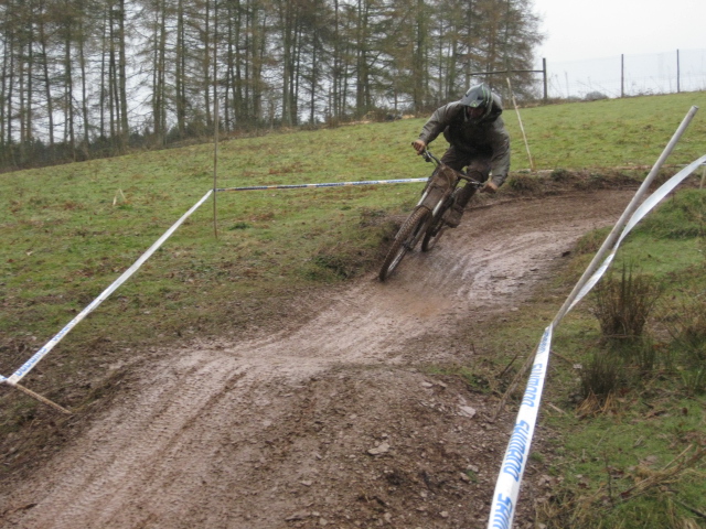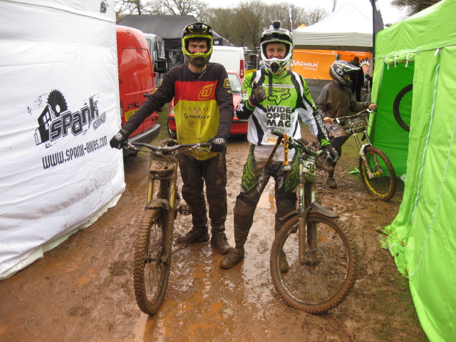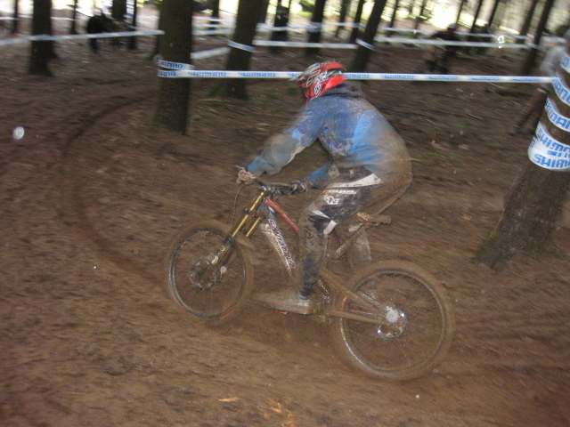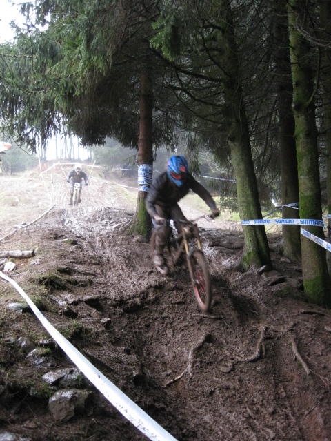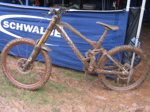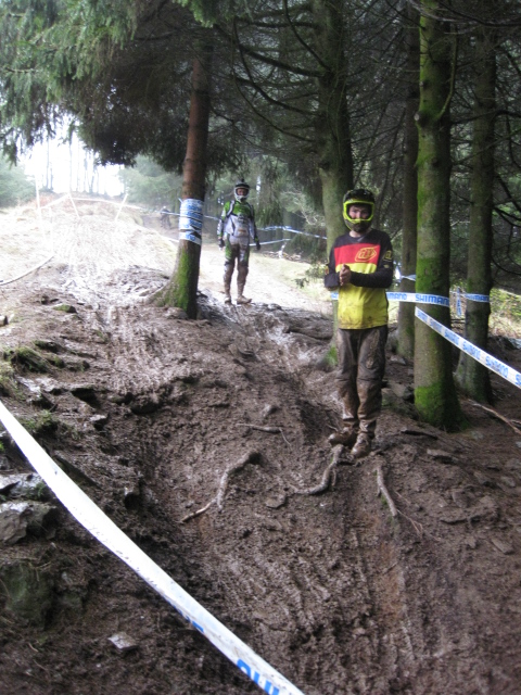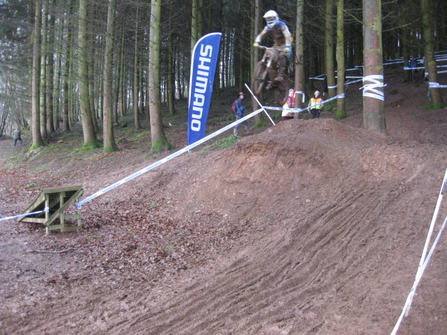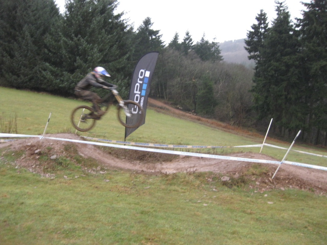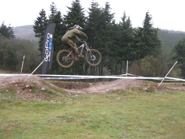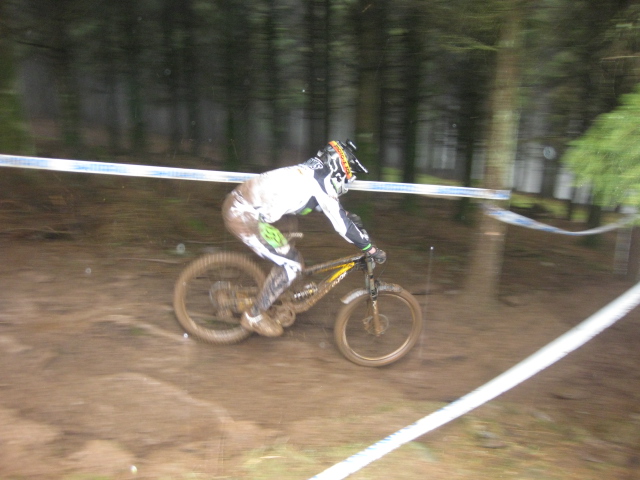 Had a quick chat with Ben Deacon he’s mental anyway but went off on one about how good this would be on hardtail because of all the mud 🙂 Ben reeled it in and was riding for fun and loving it, lots of riders were losing speed on the run into the gap jump and coming up a bit short, Ben’s take on this was to ride the easy line (slower) but just nail the jump in racing, no point binning it big time in practice and maybe screwing over race day. Some very heavy bottom outs and saddle razzing action by those that came up a bit short. Also in the last photo above, it’s been taped wide, if you can nail the jump just right you can undercut the first berm and make more of a straight line through the 2 berms. Watched Brendog and Thomas nail it all right.