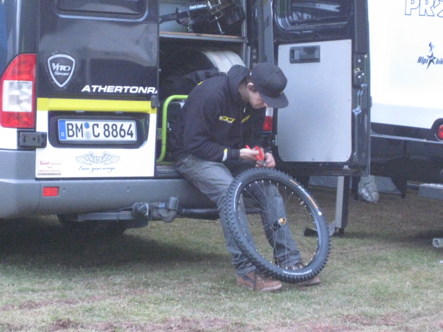 All the pro-bikes where under wraps and being prepped for practice, as i walked through the pro pit i could hear “snip” “snip” “snip” Team GT are customising tyres, perhaps the suspect weather forecast has a hand in this.