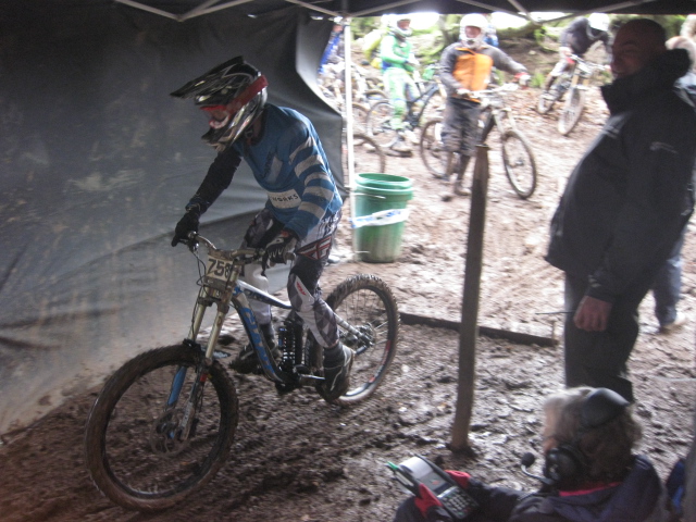 Watched the Vets category kick off for seeding, getting a clean start was hard work. The first corner had deeply rutted and pedals seemed to be getting snagged, some got a clean start, some stalled, by this time the track has had maybe 2000 runs down it, and the field was drying out but the top woods and bus stops are still wet.
