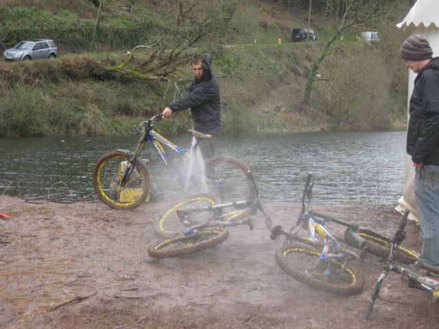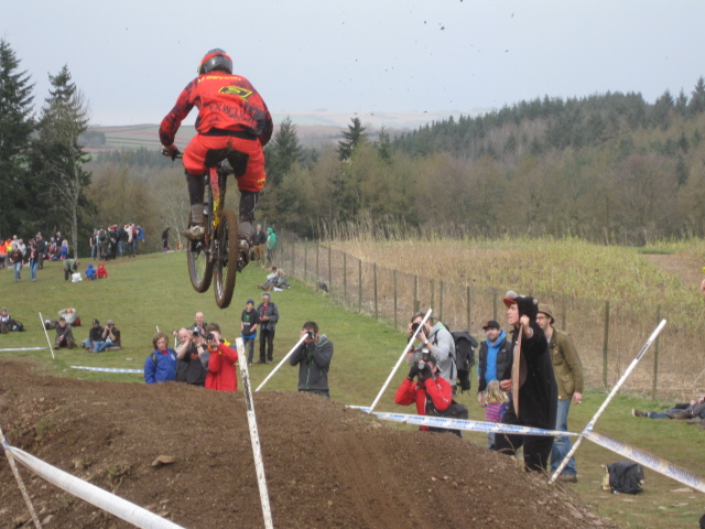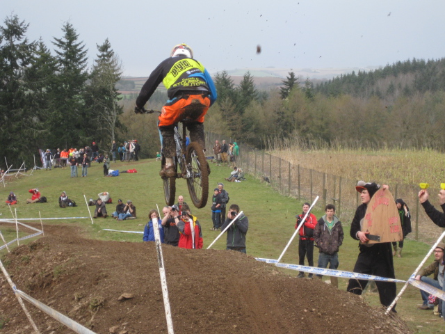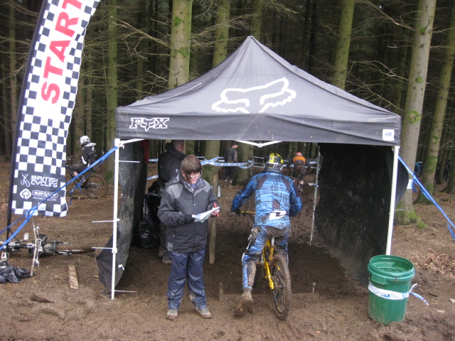 Local riders the Anderson brothers, enjoying the now technical nature of the very muddy track. Had a quick chat then walked up top to the start gate to check out the track. The bottom woods were not too bad, the field was not too bad, the middle woods where rutted up and bikes being choked up. Many couldn’t get enough speed on the run in to the gap jump, or got pinged off line, some proper lairy foot out action there, and a big crowd formed for the rest of the day.