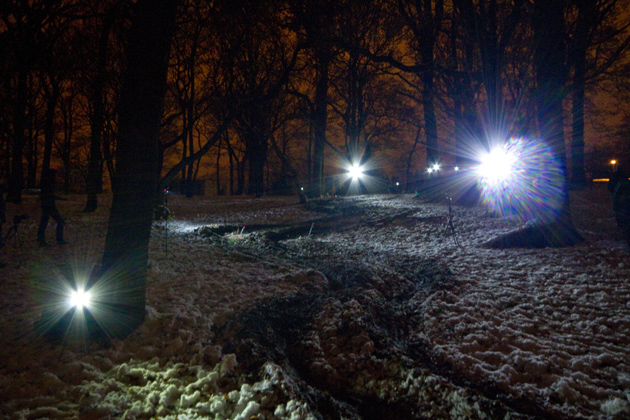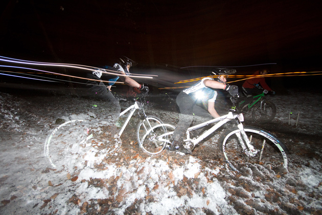 With Sheffield under a foot and a half of snow and the next round of the winter dual series just a week away I was a bit doubtful we’d be having a race this week. However, on Tuesday night 24 folk turned out to a pristine snow covered track in our local park. Under the trees the snow was only about 6 inches deep and the zero degrees temperature was keeping it a lovely consistency. The park’s in a more of a built up area than Swinny’s field so no generators were allowed this time, we were back to duct taping our bike lights to trees. It’s amazing how few lights you need to illuminate a whole track, the first time we used only three but with most people bringing one or two now we had plenty. The posts we use are white (cut up overflow pipe, thanks B&Q) so we were a bit concerned about being able to see the course. Thankfully Henry Norman, of Ride Sheffield, supplied a load of reflective slapwraps meaning we could easily see the posts and each lane was even colour coded.