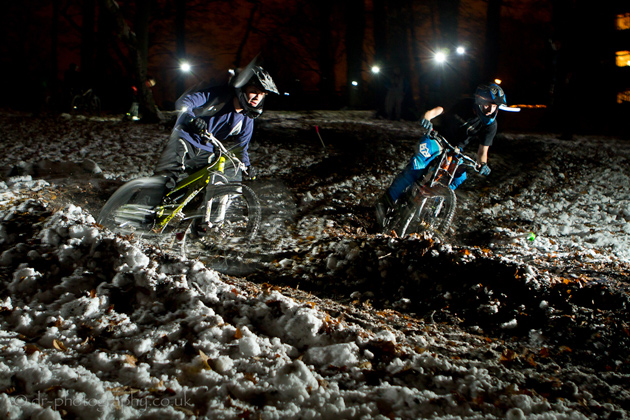 The area of the park we use is normally covered in brilliant loamy leaf mulch and previous races have been sideways affairs. However, with the few inches of snow banking up and being reinforced with loam the track was exceptionally grippy. Once it was cut in and a rut formed some of the lads were getting over to incredible angles, stomping the foot, catching the berm and powering out. However, Joe Bowman’s arse down foot paddling technique seemed to serve him well in the seeding runs.