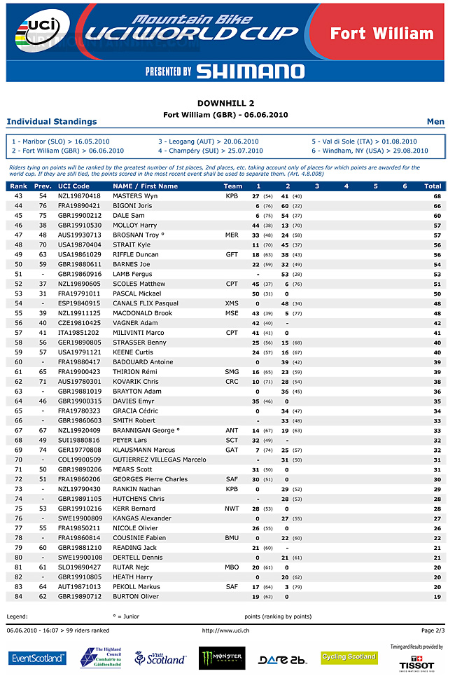 Greg Minnaar retains the leaders jersey after World Cup round two at Fort William. Gee Atherton is in second and Kiwi Cameron Cole rockets up from 8th to 3rd. Sam Hill drops to 11th after his DNS at the Fort.