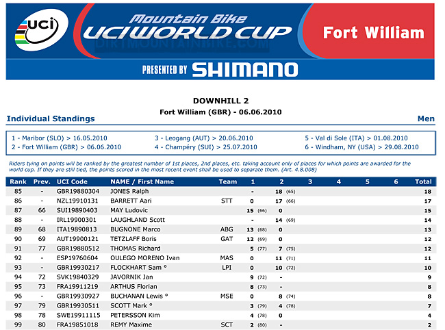 Overall Standings after Fort William WC