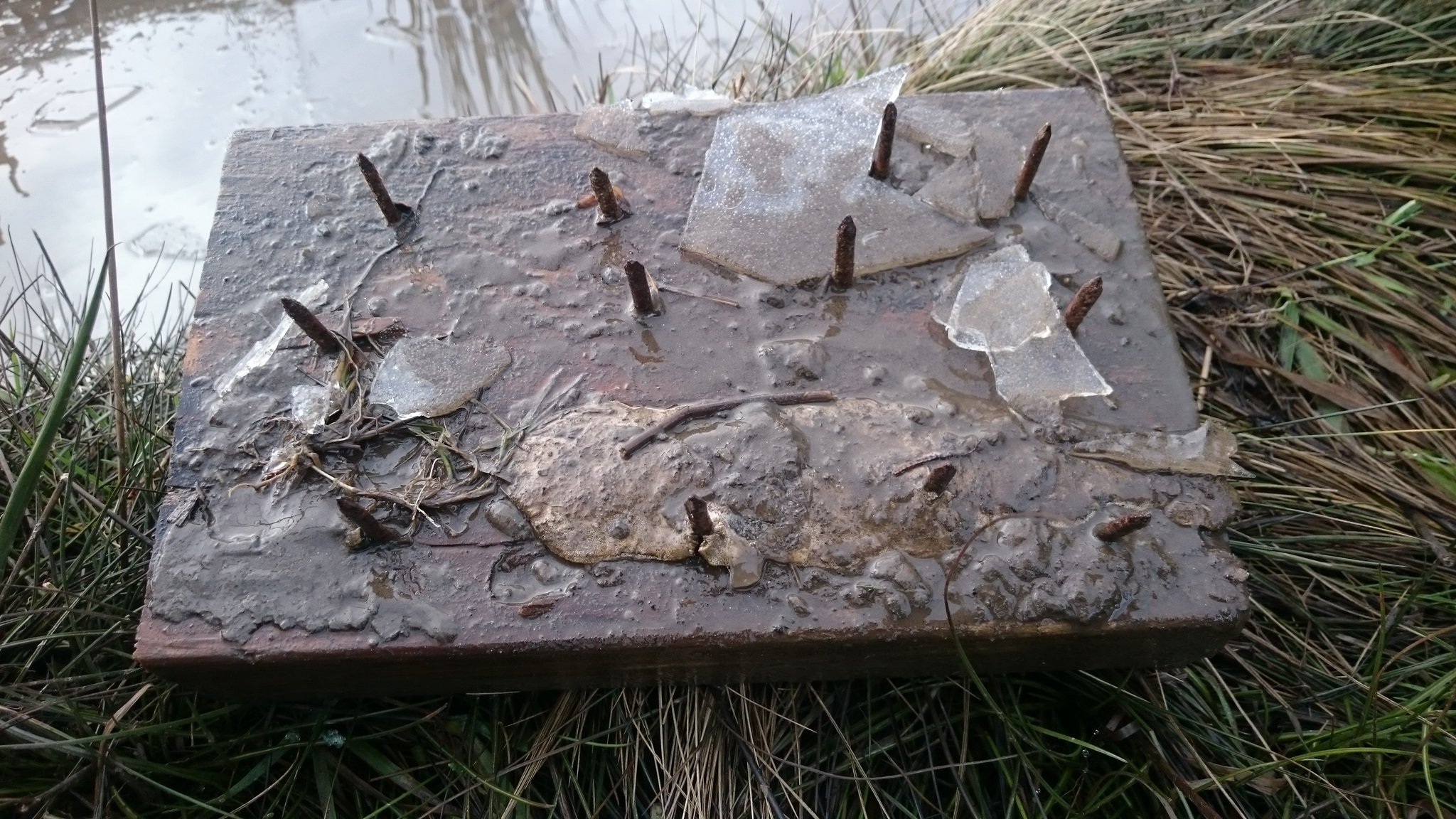 Tom wrote on his blog: “I nearly rode straight over the little piece of craftsmanship pictured above, which was floating in an icy rut on a public bridleway, earlier today. It’s clearly contrived as some sort of homebrew stinger device intended to puncture the tyres of any vehicle driving over it. Fortunately I was bimbling along slowly enough to be able to stop in time.