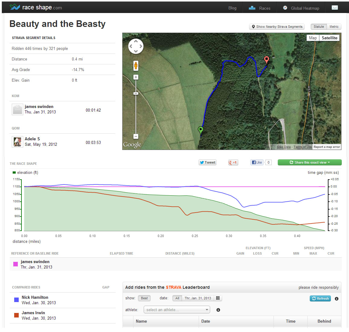 When I get beaten by someone on a Smashing Segment I like to know where they made up the time on me; RaceShape is a tool that lets you do just that. It compares the GPS data for particular segments producing a graph of time difference and an overlay on a map to see where the differences were made. The example below shows where Swinny made up 5 seconds on me on the last smashing segment. Fascinating and disheartening in equal measures.