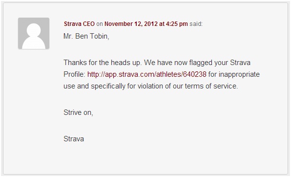 Trolling is where it all began in a battle between DrunkCyclist and Strava themselves. After writing a post entitled ‘Strava Terrorism’ declaring that the writer, Caveman, was going to take to his local trials and grab all the KOMs on his mini bike, the CEO of Strava took exception and flagged up his account( n.b. not the real Strava CEO as he’s far too busy but some very humorous joker impersonating him) .