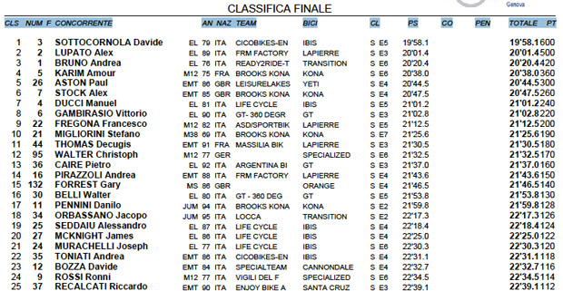 It was Davide Sottocornola (Endura Cicobikes Ibis) who made all the right compromises on bike setup and took home the win. Racing was close though, he was the only rider to break the 20 minute mark, edging out Alex Lupato (Lapierre – Team FRM) by just three seconds. Defending champion Andrea Bruno (Transition – Team Ready2Ride) was what must be a disappointing 22.3 seconds back. Nobody could touch the dominance of the Italians, Karim Amour (Kona – Brooks Bike o’Clock) was the first non-Italian in fourth, 39.9 seconds off the winners pace. Surprise of the weekend goes to the UKs Paul Aston (Yeti – Leisurelakes). In his first Superenduro raced he lightning-fired his way to fifth overall.