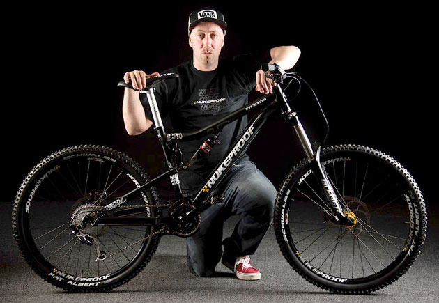 · Nigel’s black Nukeproof Snap (grey Marzocchi 4X forks, Formula brakes, white Mavic Crossmax wheels, Truvativ cranks and drivetrain)