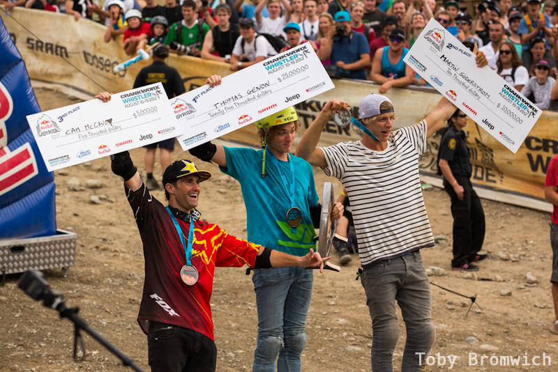 WHISTLER, BC – August 18, 2012 – The level of difficulty of the Red Bull Joyride course, designed by the athletes for the athletes, and the high level of talent that competed tonight blew away the judges and the crowd all night long. Over 25,000 wide-eyed fans were on-hand to witness 19-year-old Thomas Genon of Belgium claim the top step of the podium at Red Bull Joyride, the anchor event of Crankworx Whistler 2012. In second place was Red Bull athlete Martin Soderstrom of Sweden and in third was American Cam McCaul. With this win, all three athletes earn themselves an automatic invite to come back to compete for the next three years.