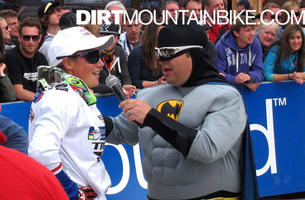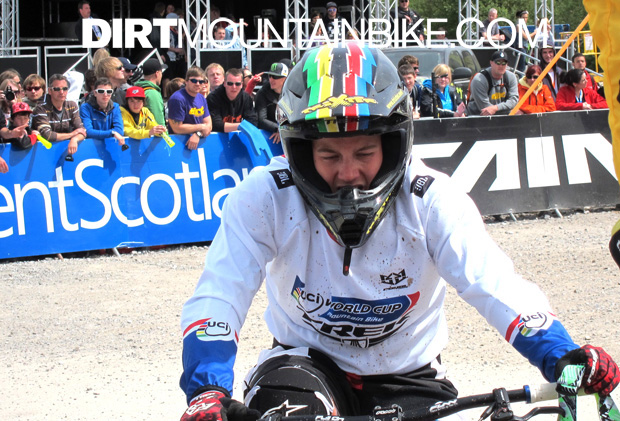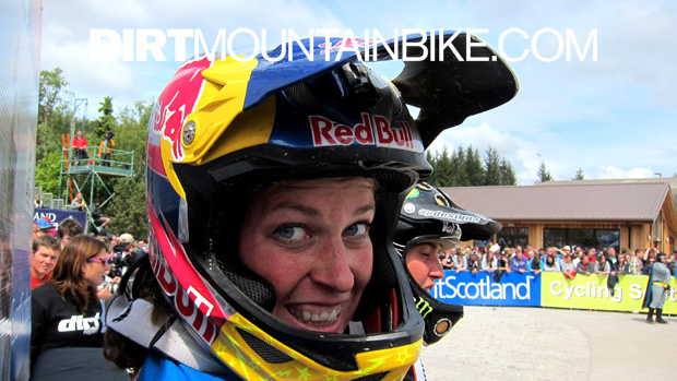 But it was Tracy Moseley who appeared in destroyer mode. 1.1secs up at the first split, 5 seconds at number 2 and then 7.5seconds ahead of Pugin at the finish. With only Atherton to go we knew it was going to be a British win. Atherton, still struggling with a shoulder injury, didn’t disappoint, she was in fact 0.9sec faster at the first split. But it wasn’t to be. She crossed the line 1.721seconds down on Moseley. A British one, two was complete. Atherton was deflated, Moseley was ecstatic and the crowd was going mental!