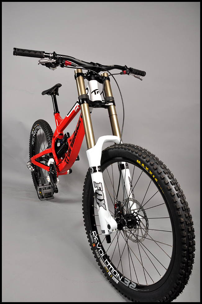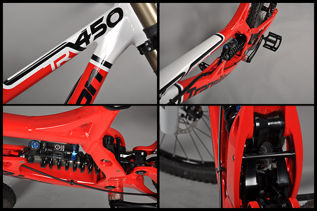 “The TR450 is our dedicated downhill racing machine. Heavily researched and selected with direct input from pro rider Lars Sternberg, this is an aggressive geo built for speed and stability. With a careful ratio between chainstay length and head angle, the frame has a neutral feel in corners with good rider weight balance between the front and rear wheels. The TR450 gets 8.25” of travel from a 9.5” x 3” shock placed low in the front triangle. The linkage was tuned to provide a gradual change from beginning to ending leverage rate. The suspension ramps up very evenly through the travel to give the bike a supple top stroke and good bottom out control without excessive sag or mid stroke wallow. This result is a consistent progressive suspension feel that is predictable and yields a high amount of tunability.