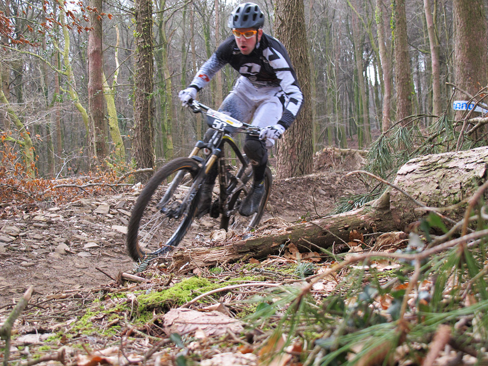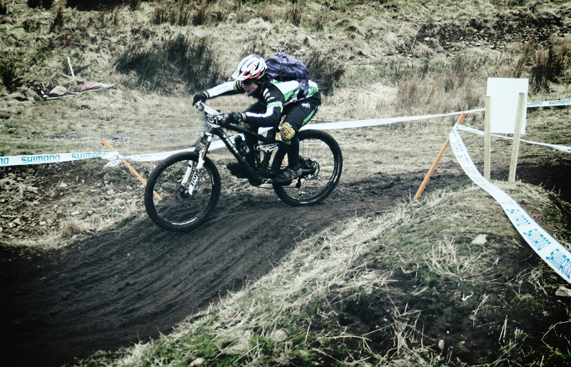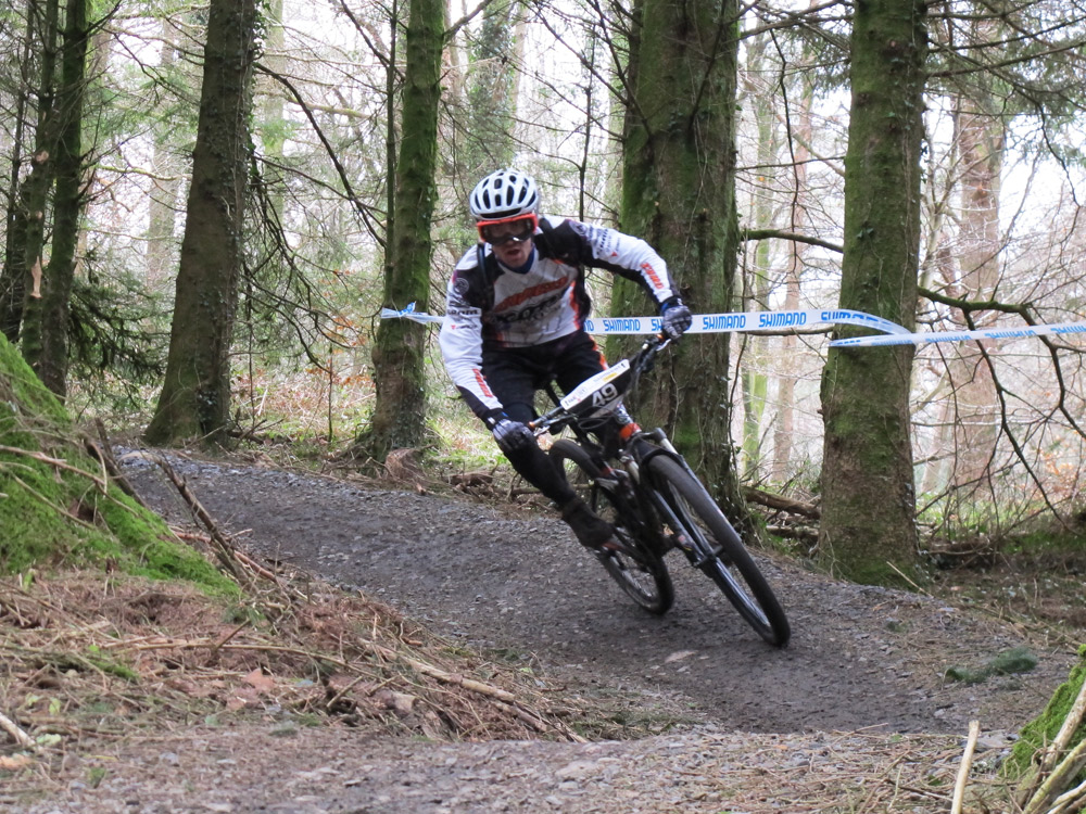 Sunday morning and the rare sight of sun was welcomed, but not for long. Fortunately however it did stay dry, very very cold but dry! The long climb and pedal up to windy point and we arrived at stage 1, where temperatures of -2 welcomed us and wreaked havoc with freezing camlebaks, freehubs, shifter cables, etc. The first stage was all trail centre track, flowing but pedally taking 3 and a half minutes at max effort. Chatting with familiar faces from the masters category, great to see the likes of Mr Tunstall, Titley and Brown racing. They had just finished stage 1 and warned us of some lethal icy patches to watch out for…great! After having a poor seeding the day before I set out to make time back, keeping speed rolling and making it past the bad ice, I was closing in on Ben, the rider infront of me, when another frozen part of the trail caught me out and I went down still holding the bars. Back up quickly I finished ok, but not the start I wanted. Turns out I wasn’t the only victim of the freezing conditions with Al Stock and Sam Flanagan hitting the deck too, a damage check revealed I managed to put a crack through my helmet when I connected with the ground….never ride without one kids!