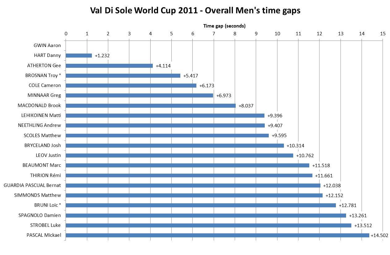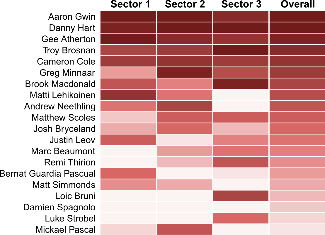 The top 20 heatmap for Val Di Sole shows a very consistent top 5 (The darker the colour the higher the position for that sector) The lowest position any of the top 5 had on a single sector was Troy Brosnan’s 7th in Sector 1. What the heatmap shows well is where some of the others threw it away. Minnaar had a poor top section (did he crash? I vaguely recollect it but it might have been another race…), Brook Macdonald hauled himself up the leadberbaord with a fast bottom section whilst Matti Leheikoinen and Andrew Neethling both had poor final splits.