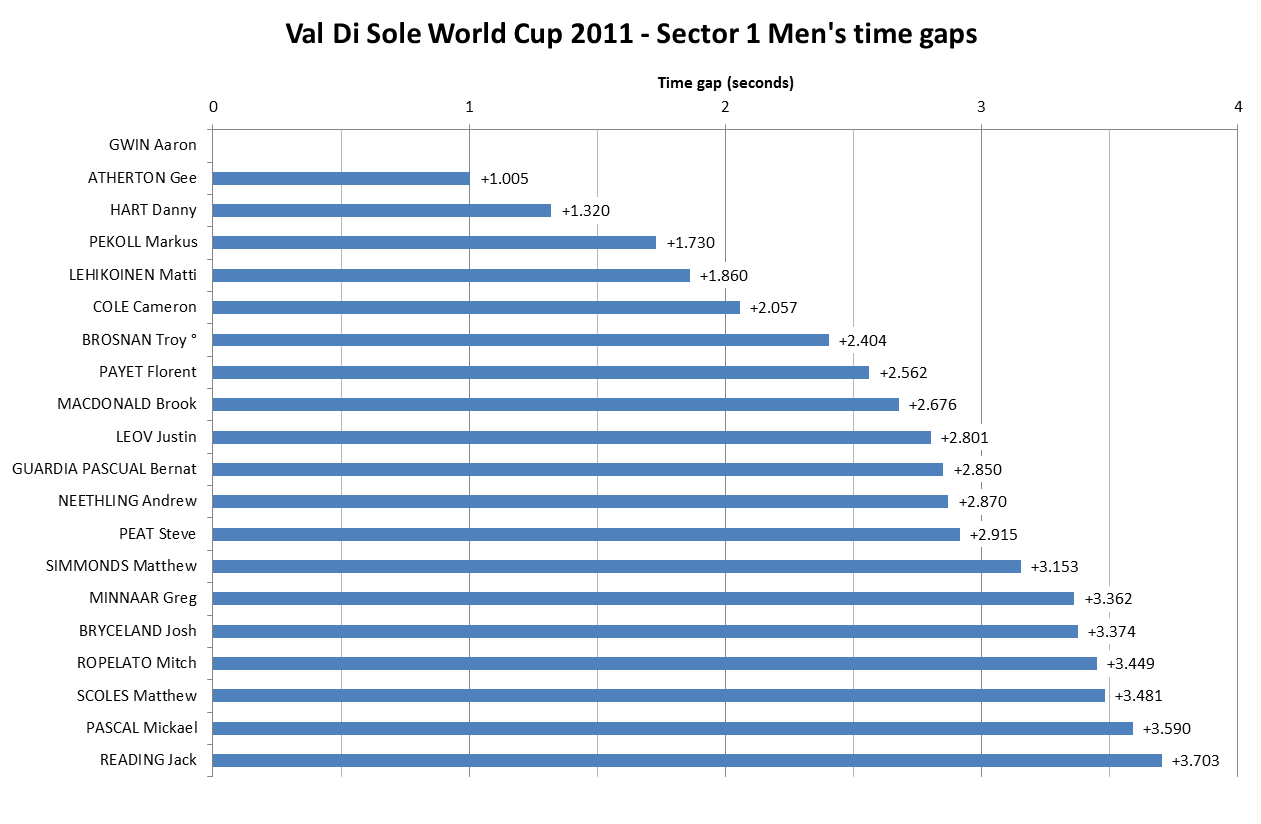 Put simply, Gwin destroyed the field in the first and second sectors. At split 1, the average gap between 2nd and 20th place was 0.15 seconds and the biggest gap between two adjacent places was 0.41 seconds (Danny Hart and Markus Pekoll). But while the rest of the field were dealing in tenths of seconds Gwin put over a second into everyone.