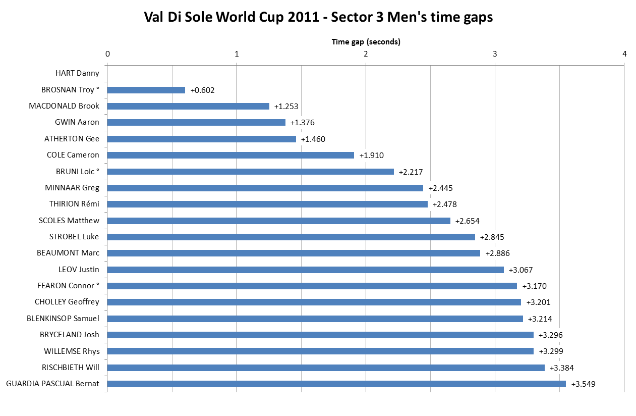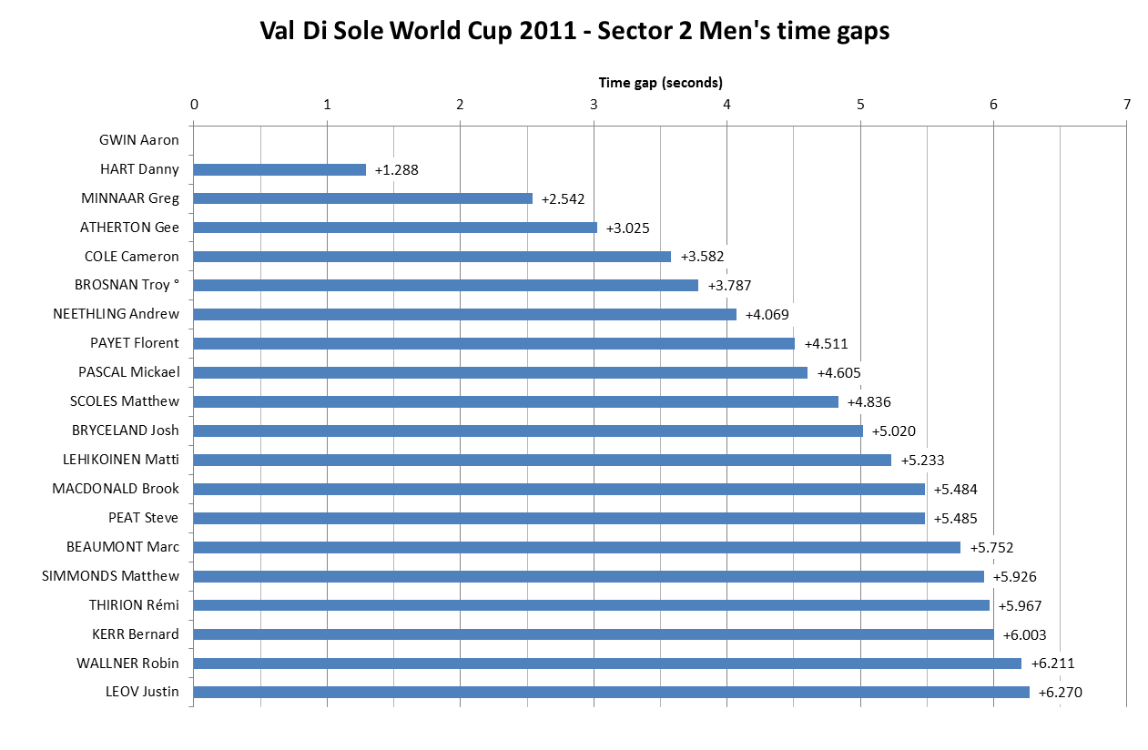 Sector 2 was the same story but with Gwin even more dominant over everyone but Danny Hart. The average gap between Minnaar in 3rd and Leov in 20th was 0.277 and the biggest indivdual gap 0.557 but Gwinn stuck over 2 1/2 seconds into the lot of them! Hart burst out of the pack in this sector on a run of speed that would eventually take him all the way to the top step of the World Championship podium. Although he was still over a second behind Gwin he was also a full second faster than anyone else in the field.