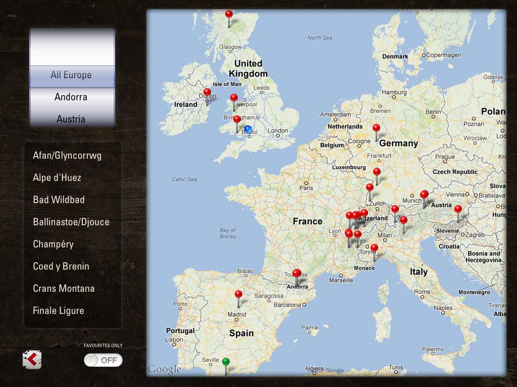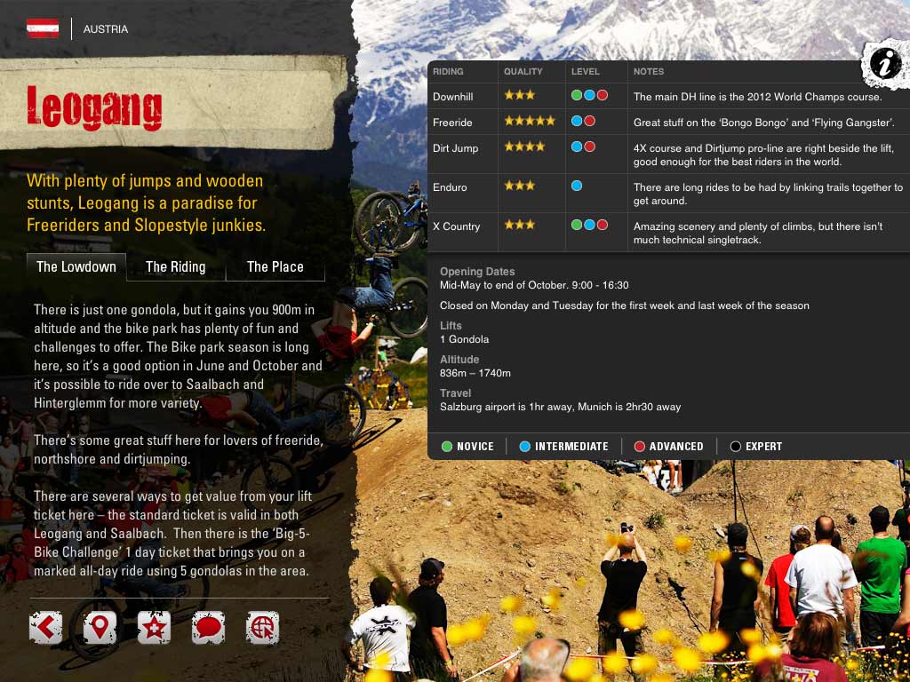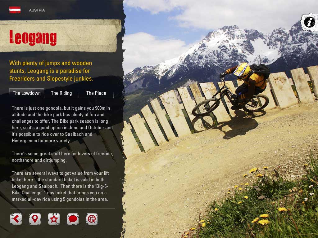 The highlight of the App is an extensive gallery of over 250 of the best photos from the archives of Victor Lucas, culled from 10 years of following the World Cup circuit and visiting a wide variety of MTB locations during that time. The App uses the iPad’s map and GPS to find your location and show the riding locations around Europe. Each location is reviewed in detail, giving the juicy inside information on what the riding is really like in these places – along with a gallery of high quality photos. Links to bikepark websites and local guiding companies will help you plan your trip. Star riders and racers weigh in with their opinions on their favourite destinations for the best biking action.