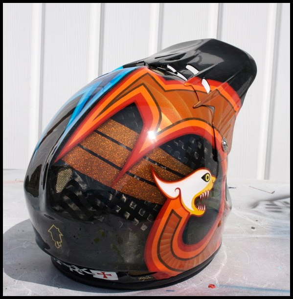 Do you customize anything else apart from lids, bikes, cars etc, would you do my van if I shipped it over to you? I’ve done some random small parts like shifter covers, but mostly helmets. They’re easy to paint in a small area and are fun for me because of the challenge of painting on such a complex surface. I have painted my own mountain bike but it’s hard to match the durability of powdercoat on metal so I don’t really advertise it at this time. I have just recently started doing some automotive painting and if you wanted to send me your van I could spray it up no problem. Although with the cost of airfare it might be cheaper to fill it with golf balls and float it across.