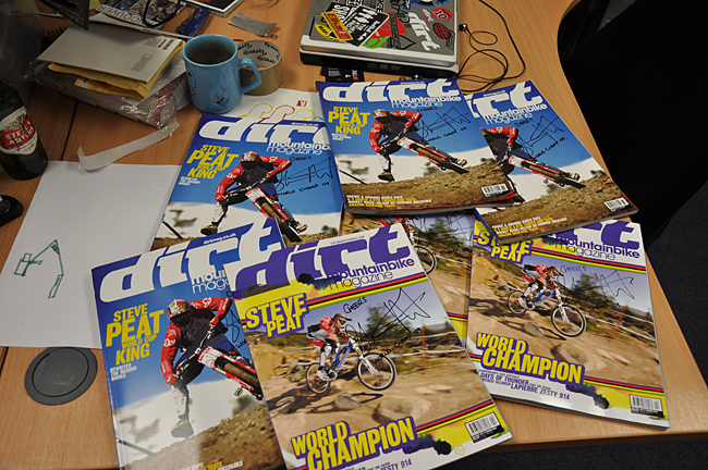 Here then is an impromptu Dirt competition…if you want to win a signed Steve Peat Dirt magazine then just post a witty caption to the photo below, let’s call it a “Caption Competition”