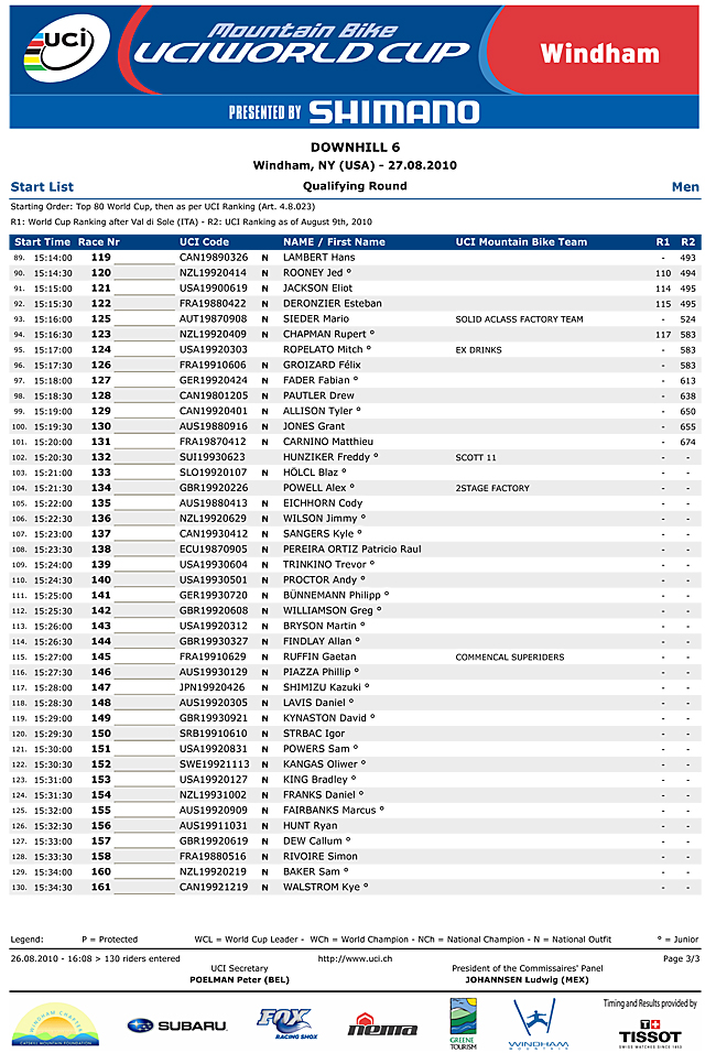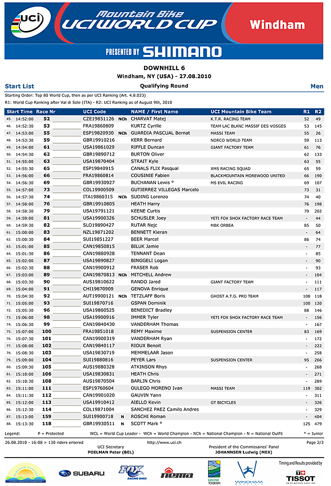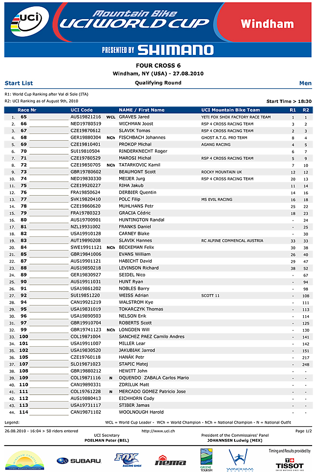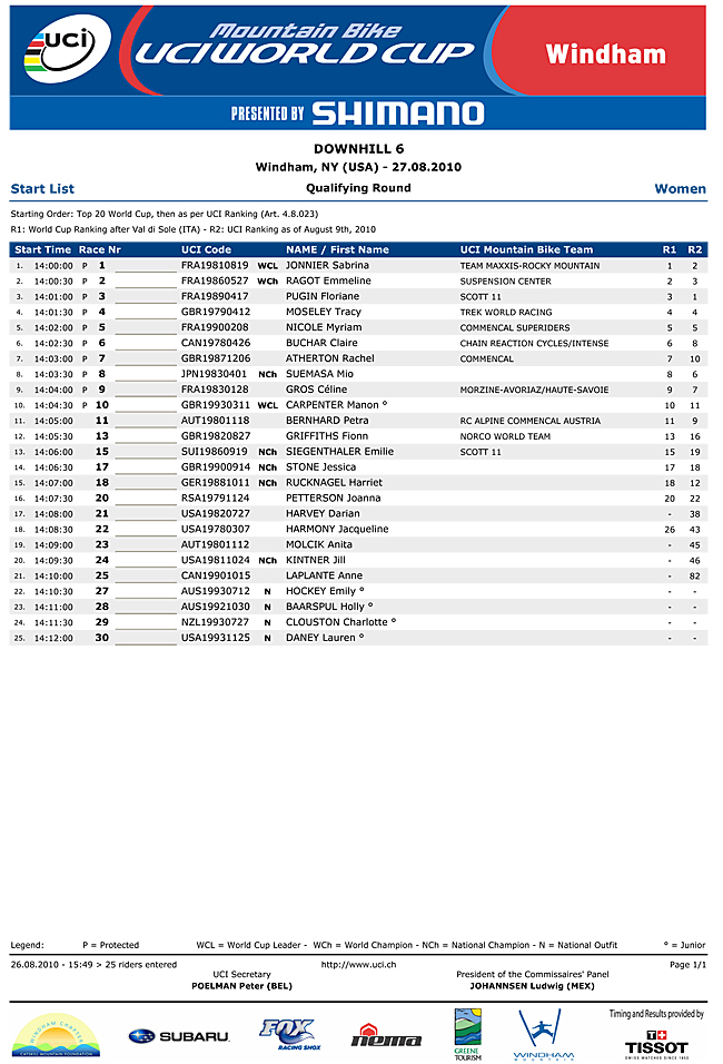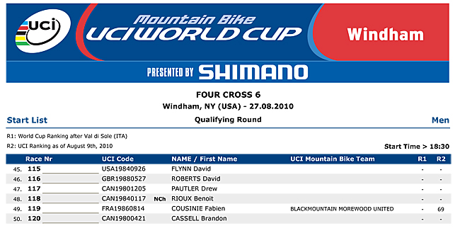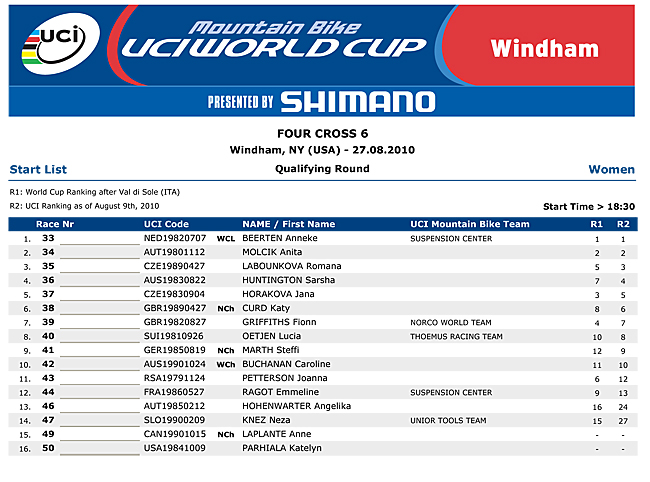The complete list of who has signed on for downhill and 4x at UCI World Cup round 6, Windham, New York.