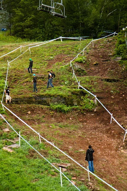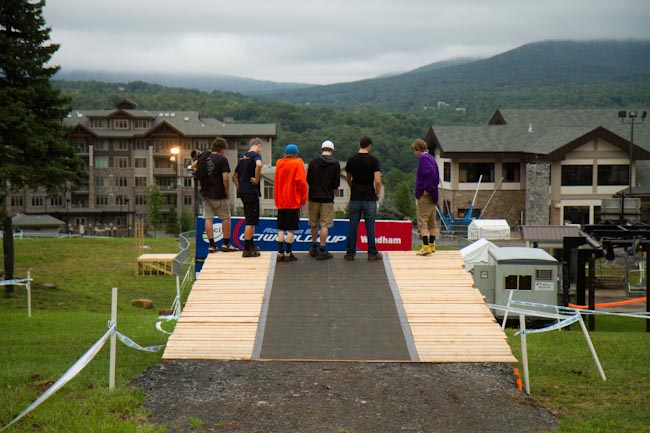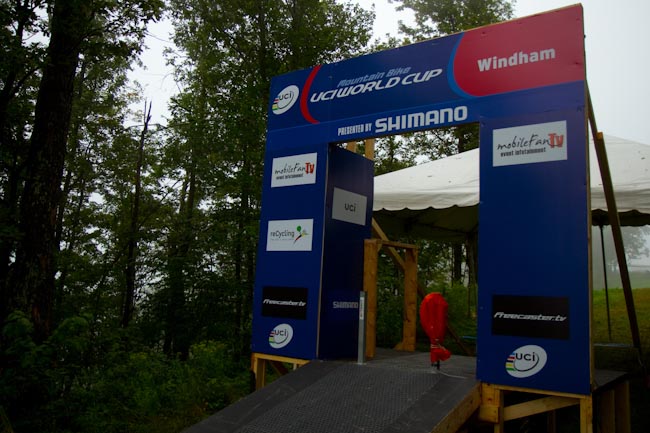 The short chairlift climbs into the low cloud that has descended on the mountain specially for the World Cup. The running joke in the pits is that the World Cup series should start visiting the drier parts of the world where they could really benefit from the rain the series inevitably brings! On a more positive note the weather is set to clear out for the rest of the week so the track may dry out in time for qualifying and racing at the weekend. The only dry race so far this year has been Fort William in Scotland, so maybe the riders will be able to test out their dry tires for the second time this year here in Windham.