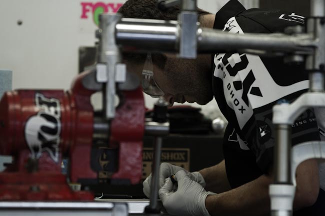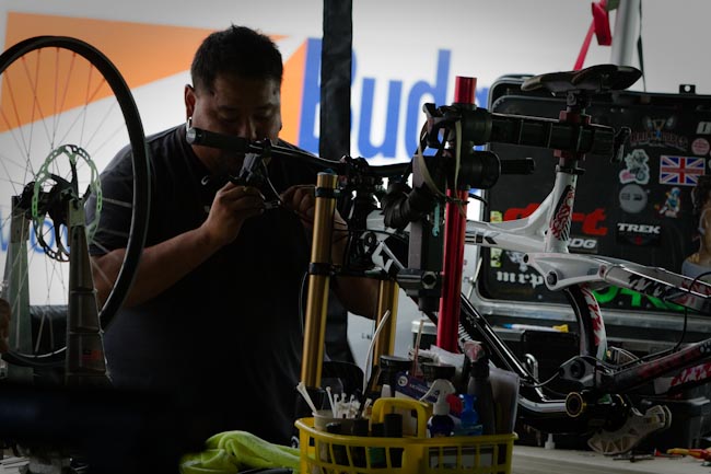 It’s only Wednesday and Justin Frey of Fox is already hard at work tuning and rebuilding suspension. He has to be one of the most committed and hard working individuals on the circuit. His job involves many hours driving the truck and trailer across the country as well as countless hours spent fettling suspension for the world’s fastest racers. It’s no small coincidence that he’s in for the running of the World Cup series overall title, proof of his consistency.